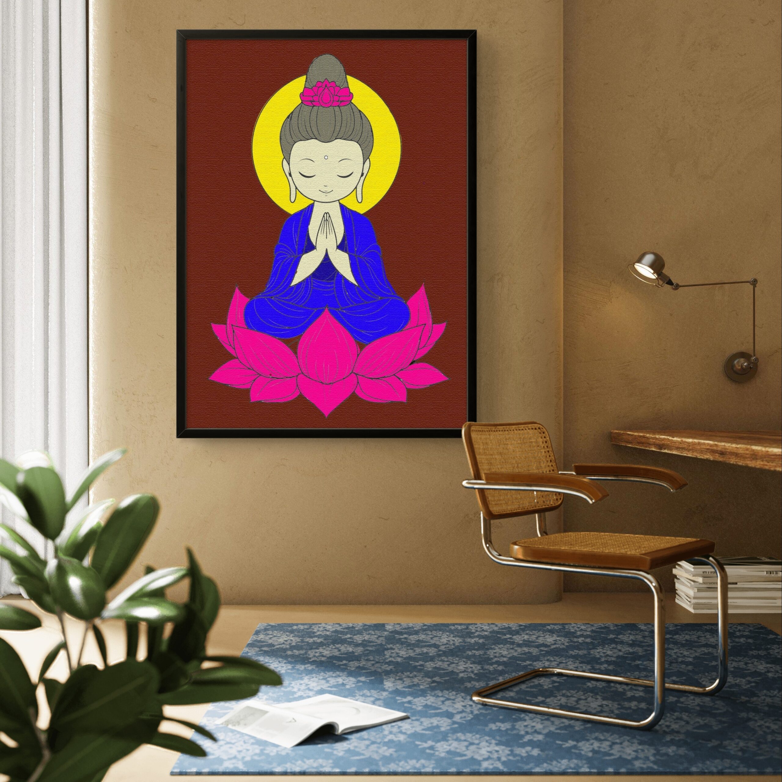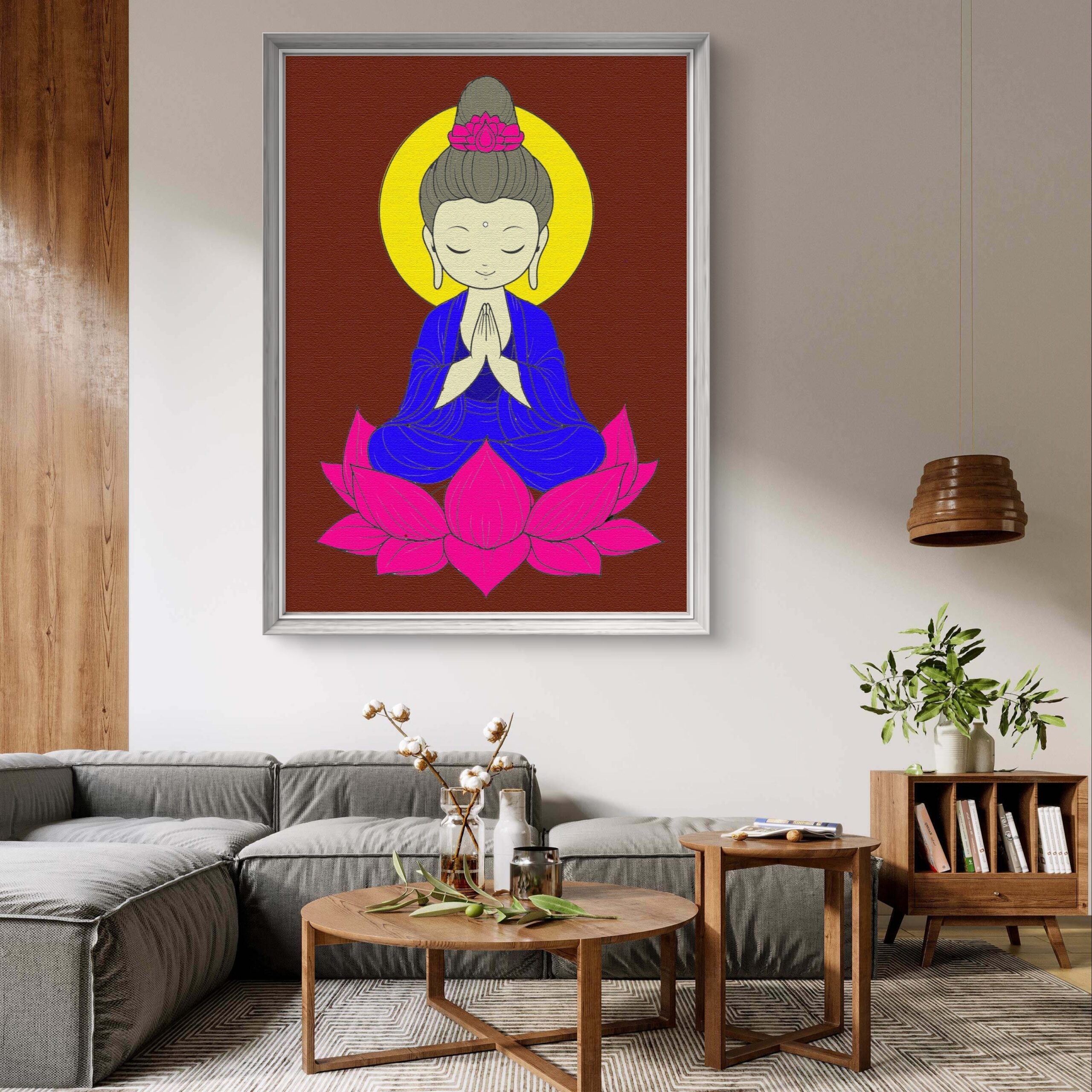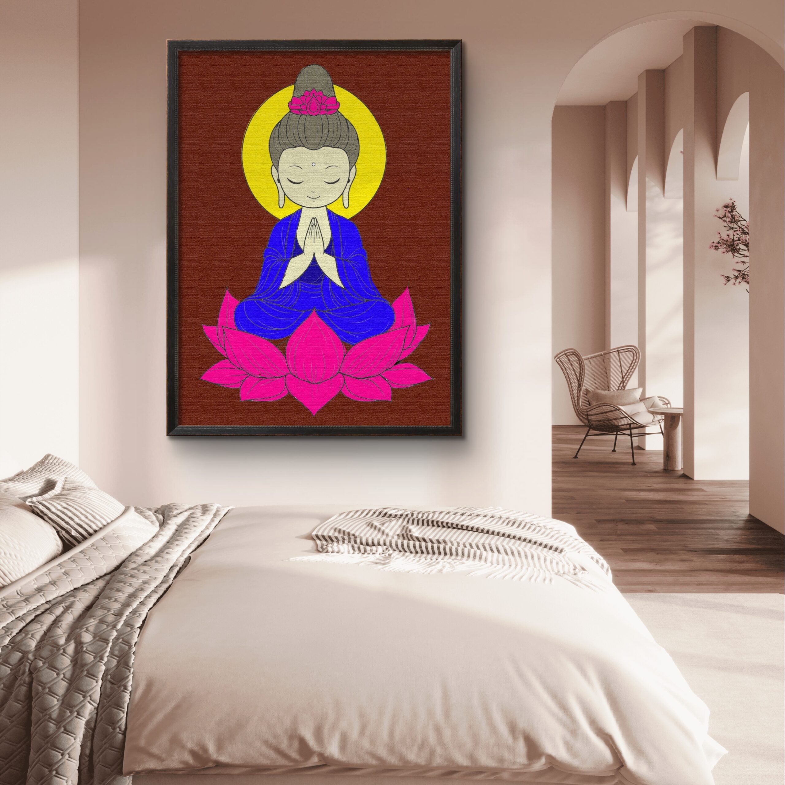 A serene Buddha figure seated on a large pink lotus flower. The figure is shown in a meditative pose with hands pressed together in a prayer gesture (Anjali Mudra). A bright yellow halo is visible behind the head, and a smaller pink lotus flower adorns the top of the figure’s hair bun. The background is a solid brown color.