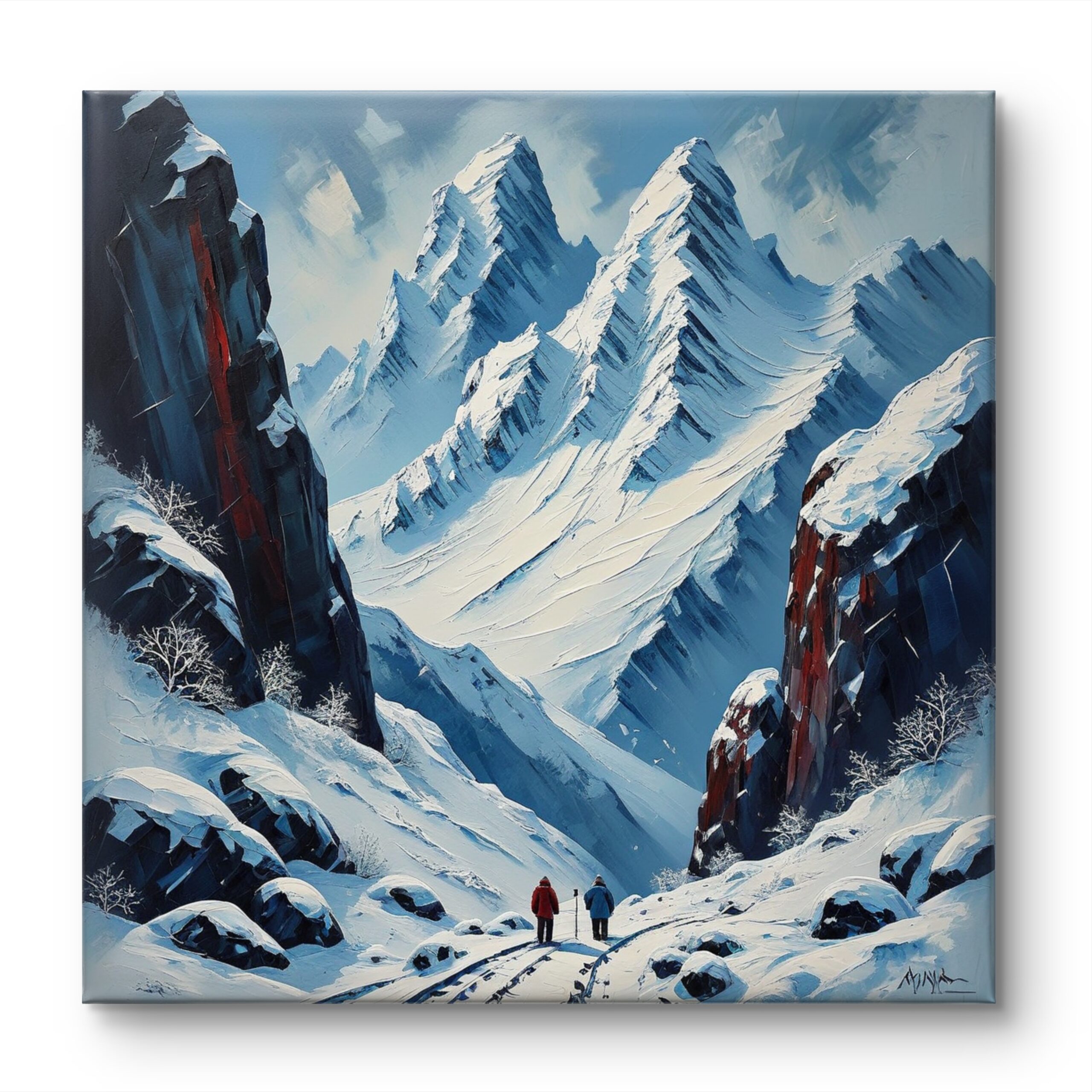 This tranquil landscape captures the stillness of snow-covered mountains under a soft sky. The serene whites and subtle shadows evoke peace, purity, and the quiet majesty of untouched nature.